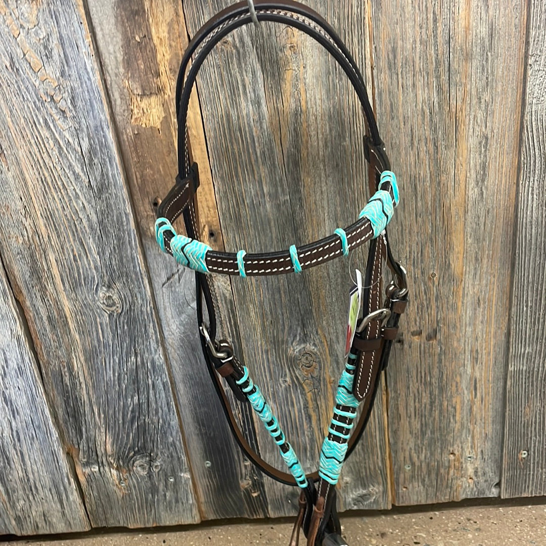 Dark oil browband headstall with turquoise rawhide lacing details.